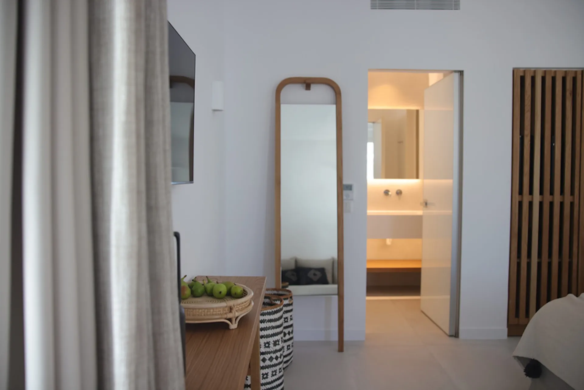 The balcony offers our most secluded positioning—completely private, with views that remind you you’re in Mykonos. Inside, premium linens, soundproofing, blackout curtains, Smart TV, air conditioning, and luxury Greek toiletries.